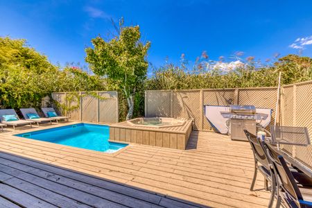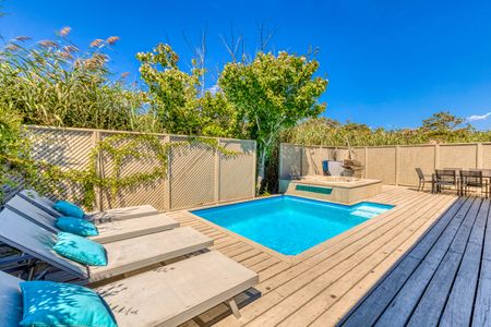 189 Fire Island Boulevard presents a beautifully renovated three-bedroom beach house, a perfect blend of style and comfort. Featuring two double bedrooms and a twin room, it accommodates various group sizes with ease. The property boasts new flooring, granite countertops, and wood cabinets, complemented by stainless steel appliances. Indulge in the luxury of a hot tub with a waterfall flowing into an electrically heated pool. Air conditioning ensures indoor comfort, while the pool area invites sunny relaxation. Every detail in this home has been meticulously updated, promising a high-quality vacation experience in Fire Island Pines.