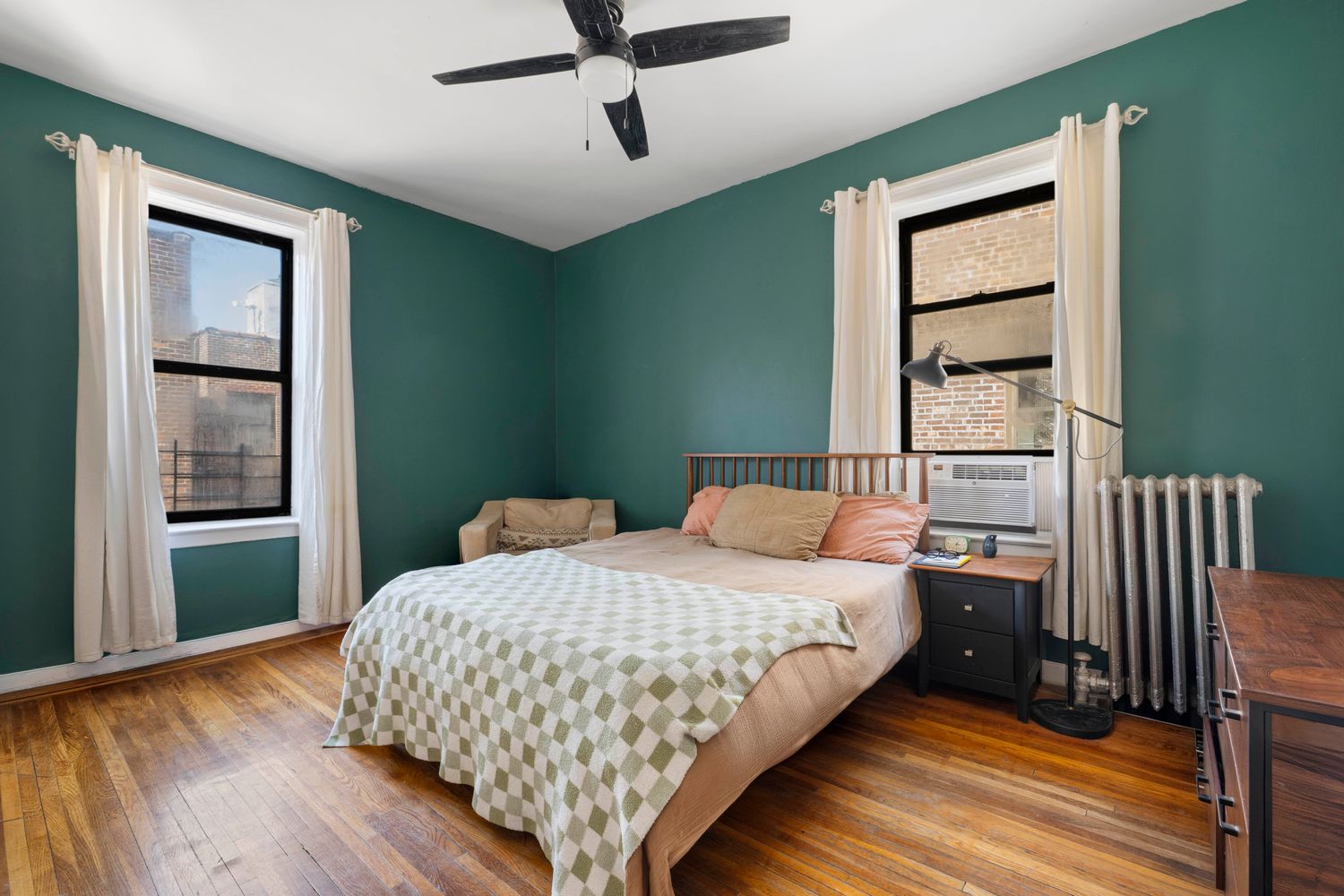 The home has been well-maintained, featuring original hardwood flooring throughout and large windows that invite steady natural light into every room. The renovated windowed kitchen provides a functional workspace with ample cabinetry and a pantry, while the oversized bedrooms offer enough square footage to comfortably fit king-sized furniture with room to spare.