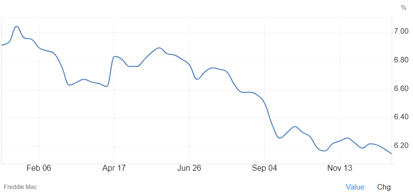 The average rate on a 30-year fixed mortgage decreased to 6.15% as of December 31st from 6.18% in the previous week, according to data from Freddie Mac. “After starting the year close to 7%, the average 30-year fixed-rate mortgage moved to its lowest level in 2025 this week, an encouraging sign for potential homebuyers heading into the new year.”. source: Freddie Mac